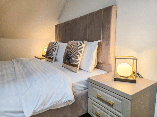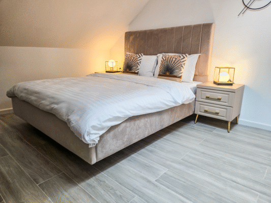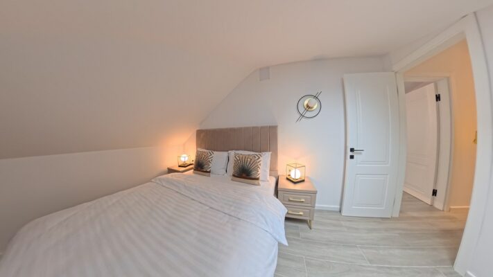 Dormitor separat cu pat King-size, saltea premium și lenjerie fină din bumbac satinat