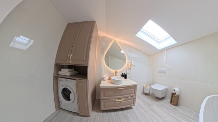Baie privată modernă, cu duș tip walk-in sau cadă, prosoape pufoase și produse cosmetice premium